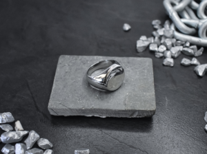 Anillo fabricado en titanio inoxidable revestido en platino de alta dureza y resistencia con engaste de piedra ónix pulida.