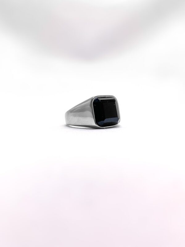 Anillo fabricado en titanio inoxidable revestido en platino de alta dureza y resistencia con engaste de piedra ónix pulida.