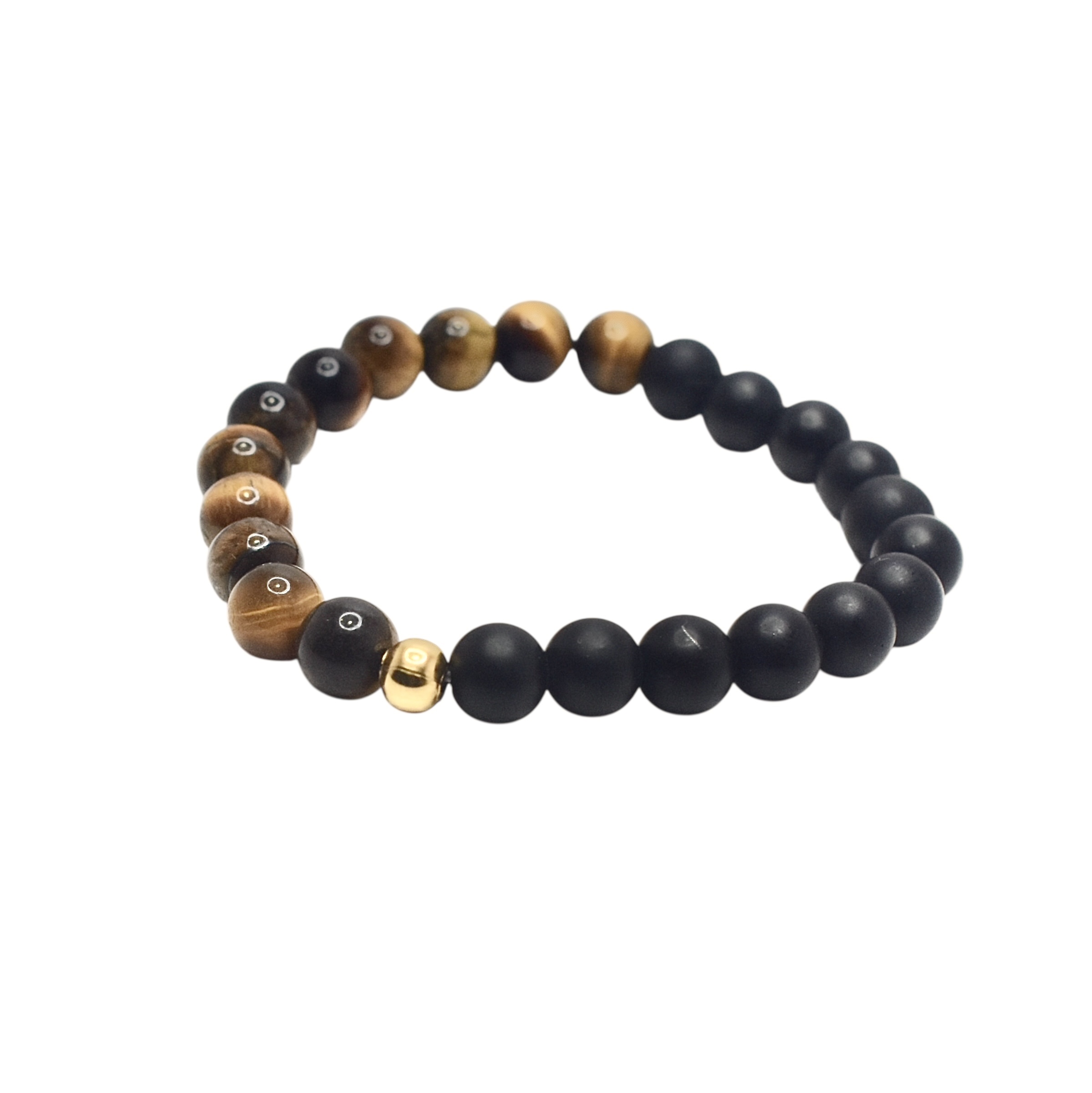 Material: Ónix mate, ojo de tigre y balín en titanio anodizado y enchapado en oro de 18kt.